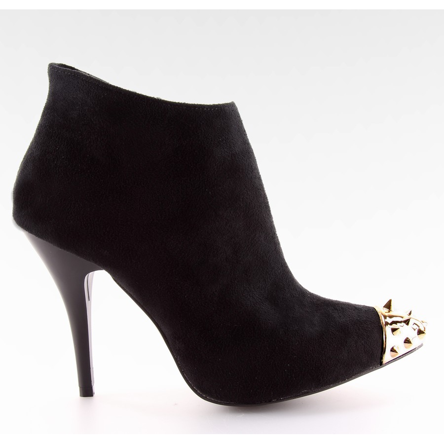 Elegáns fekete bokacsizma 10 cm magas sarokkal, velúr ökológiai bőrből. Az arany mandula lábujjak és a finom szegecsek karakteressé teszik őket. A modell finom szőrmével bélelt, így hidegebb napokra is alkalmas. A belső cipzár megkönnyíti a fel- és levételt.