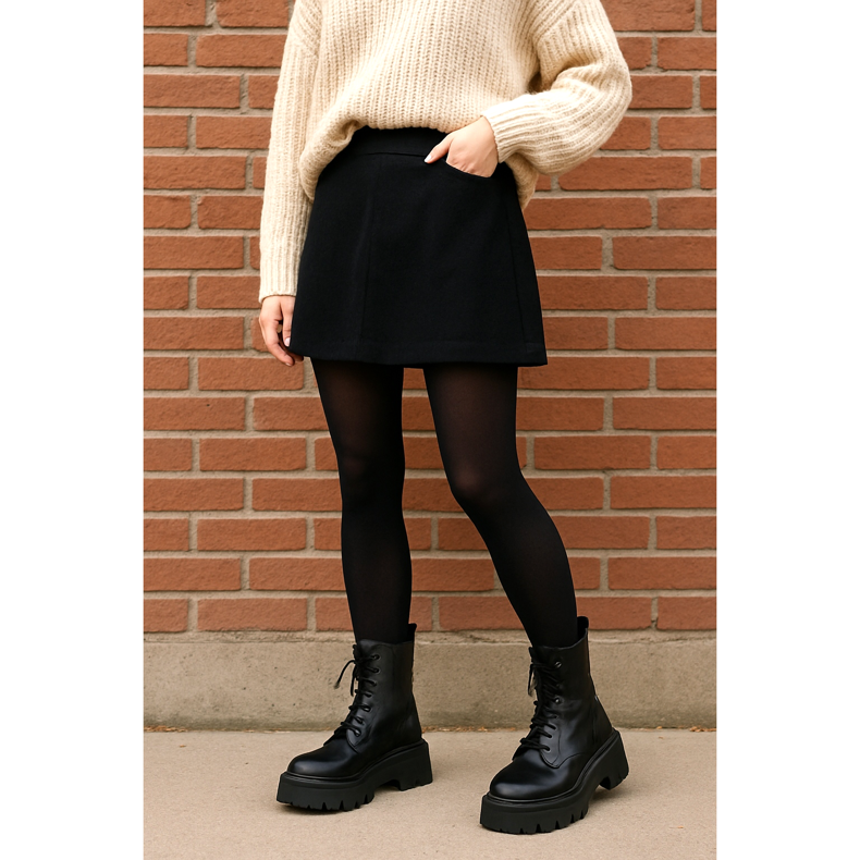 A vaskos csizmák rövid miniszoknyával is jól mutatnak. A vulgáris hatás elkerülése érdekében válasszunk vastag, fekete harisnyát (átlátszatlan) és lazább felsőt, pl. egy vastag kötésű pulóvert részben az öv mögé bújtatva. A vastag talp vizuálisan karcsúsítja a lábakat, a magas felsőrész pedig karaktert kölcsönöz. Ez a tökéletes stílus őszi sétákhoz vagy baráti találkozókhoz.