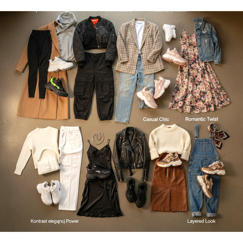 Réteges megjelenés – a vaskos tornacipők a többrétegű formázás alapjai különféle textúrákkal – kötöttáru, bőr, farmer, selyem.