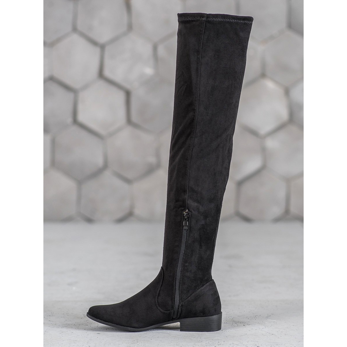 Íme a tökéletes lábbeli azoknak a nőknek, akik a stílust a kényelemmel szeretnék ötvözni - fekete velúr muskétások a SHELOVET-től. Ez a legjobb minőségű ökológiai velúrbőrből készült érzéki csizma tökéletes választás a hidegebb napokra. A hosszú, térd fölé érő felsőrész nemcsak hatékonyan védi a lábfejet a széltől és az esőtől, hanem optikailag is meghosszabbítja a lábakat, kiemelve azok formás alakját.