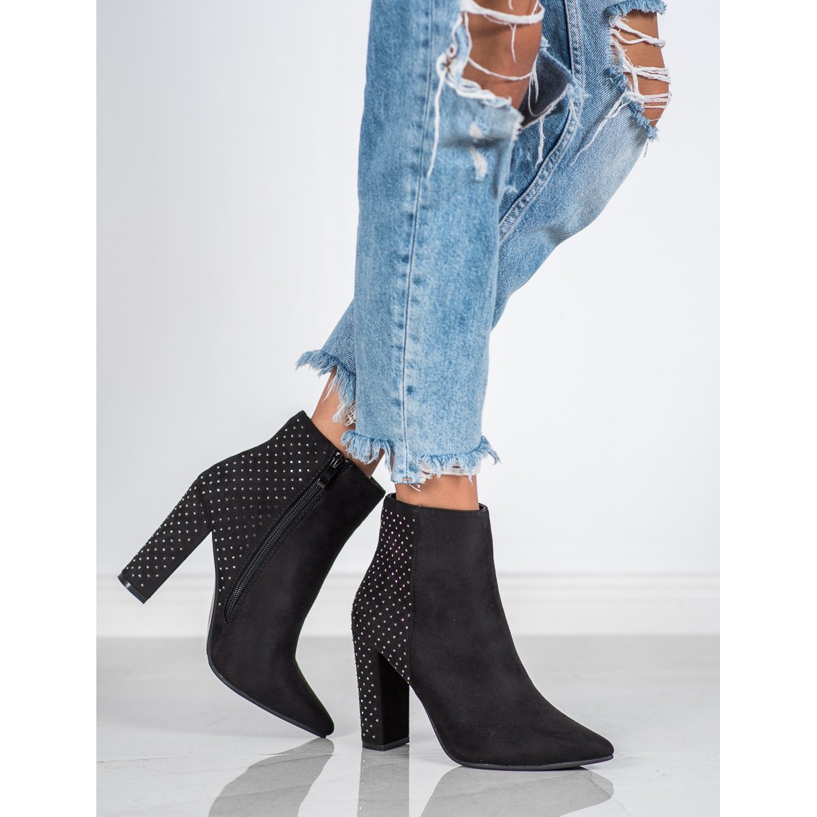 A csizmák kiváló minőségű ökológiai velúrbőrből készültek, ami nemcsak elegáns megjelenést, hanem tartósságot is biztosít. A cipők hátulján elhelyezett dekoratív strasszok egyedi fényt kölcsönöznek nekik, így tökéletes kiegészítője lehet hétköznapi és elegánsabb ruháknak is.