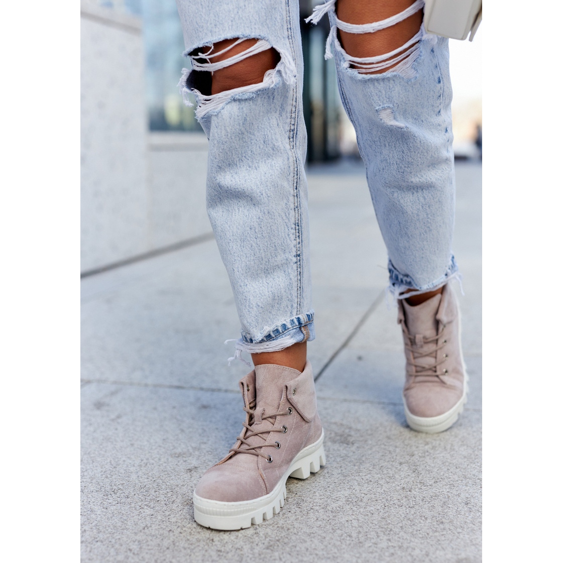 Stílusos és kényelmes csizmák, amelyek karaktert adnak az alkalmi készletekhez. Ökológiai velúrból készül, divatos, könnyű árnyékban. Helyezze egy vastag, vágott talpra, lekerekített, merevített orrával és kerek csipkékhez. A felső a boka eléri, és kissé feltekeredik, amelyet a városuk, az informális karakter hangsúlyoz.