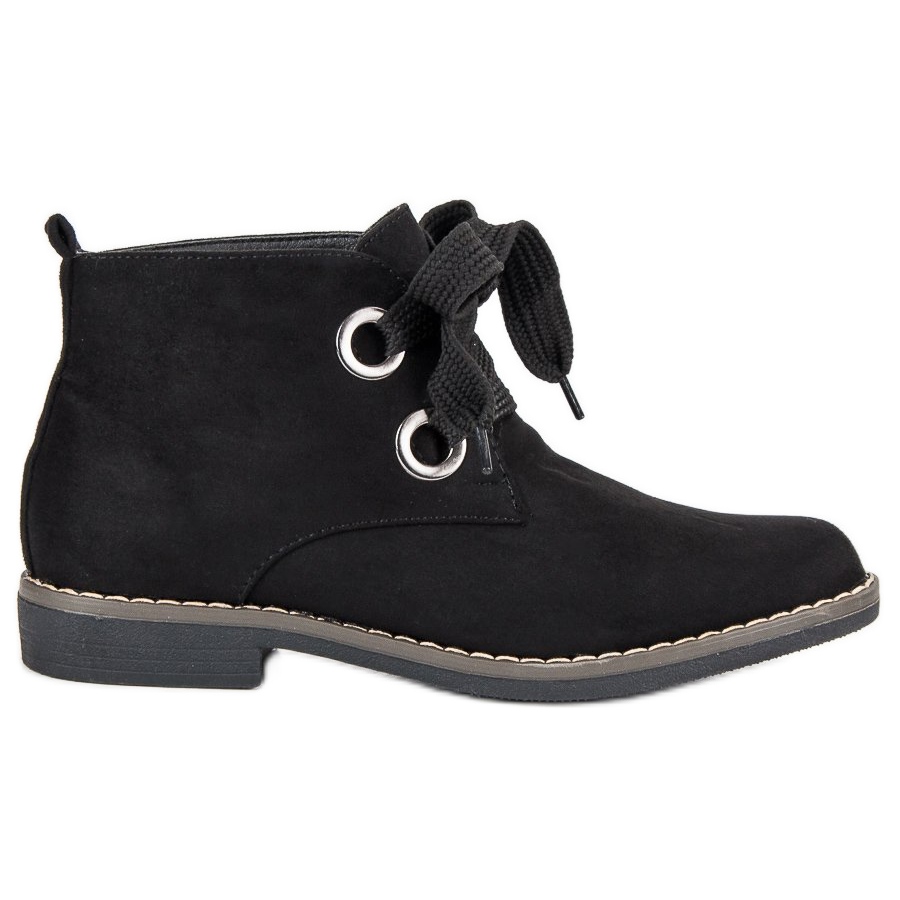 Fedezze fel az eleganciát és a kényelmet a Super Mode fekete fűzős bokacsizmáival! Kiváló minőségű ökológiai velúrból készült stílusos cipők tökéletes kiegészítői az őszi és téli stílusnak. A kör alakú dekoratív fém hurkokkal és széles fűzőkkel nem csak divatos megjelenést, de viselési kényelmet is biztosítanak.