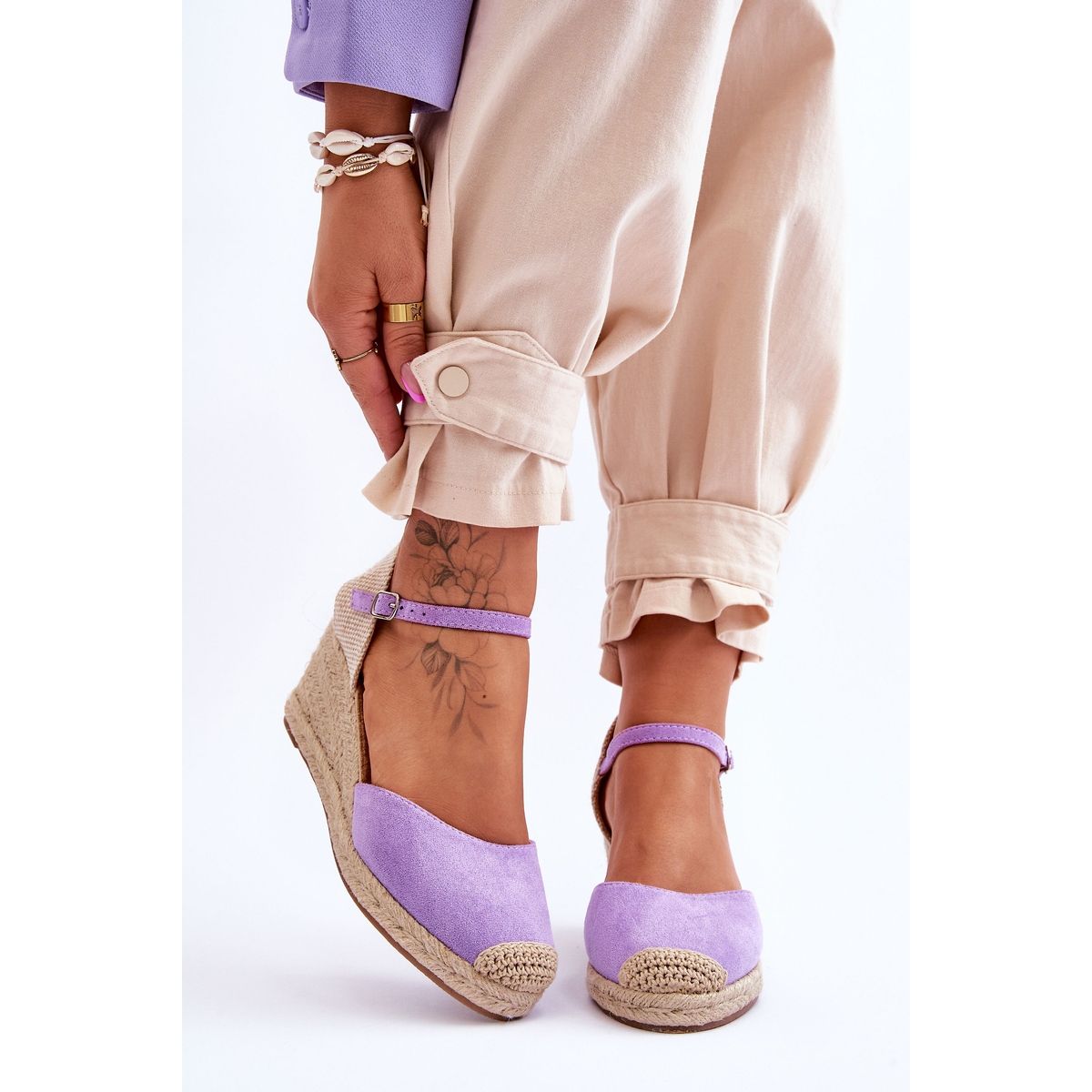 Az FJ1 lila ék alakú espadrill szandál tökéletes választás azoknak a nőknek, akik értékelik az eleganciát és a kényelmet. Kiváló minőségű öko-velúrból és szövetből készült klasszikus szandálok ötvözik a modern stílust a hagyományos dizájnnal. A boka körül csattal ellátott állítható pánt tökéletes illeszkedést, kényelmes, csúszásmentes gumitalp pedig biztonságot nyújt járás közben.