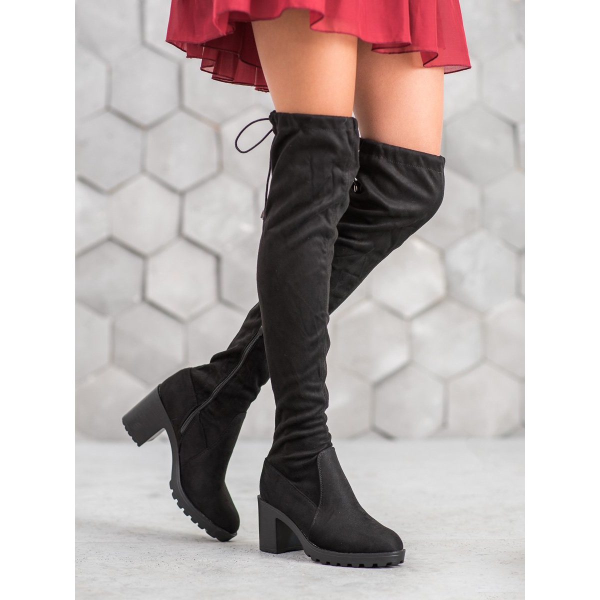 Fedezze fel az eleganciát és a stílust a Small Swan muskétások fekete színben, amelyek tökéletes választás a klasszikus és modern divatos megoldásokat kereső nők számára. Ezek az egyedi, masszív 8 cm magas sarkú cipők nemcsak kényelmet, de stabilitást is biztosítanak járás közben. Fejlett kialakításának köszönhetően a térd feletti felsőrész hatékonyan véd a hideg ellen, így ideális választás a hidegebb napokra.