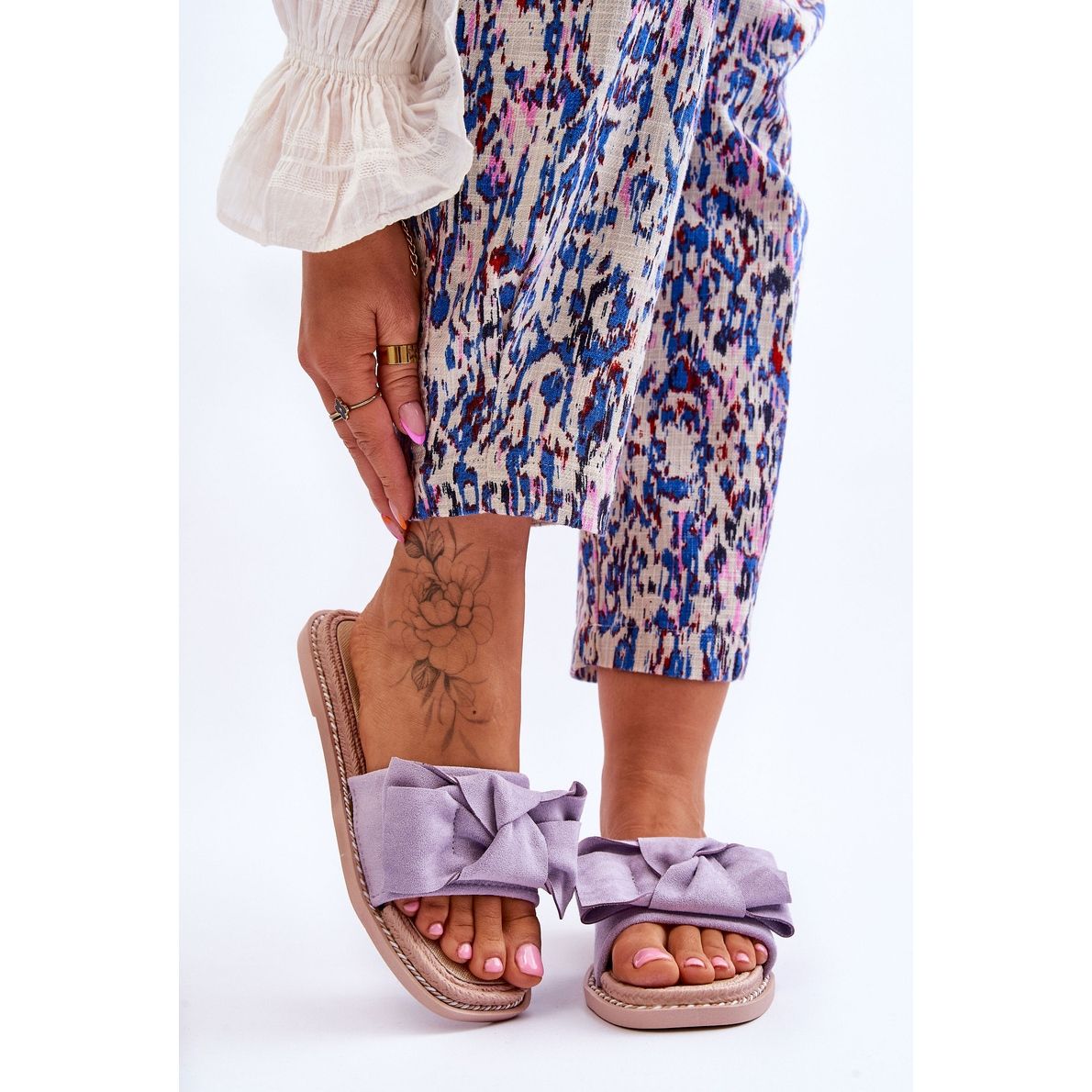 Elegáns, ugyanakkor kényelmes papucsok, ideálisak a mindennapi stilizációkhoz tavasszal és nyáron. Az ökológiai velúrból készült felső, finom lila (lila) árnyékban, finom íj díszítve. A gumi műanyagból készült beszúrás és talp biztosítja a kényelmet, a rugalmasságot és a használat tartósságát. A talp nem szellőző, és széle körül van egy dekoratív karakterlánc, amely hozzáadja a karaktert. A modellt alacsony, lapos sarokra állítják (platform/talp kb. 1,5 cm), ami garantálja a stabilitást és a kényelmet a nap folyamán.