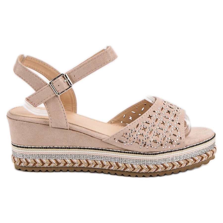 A Groto Gogo szandálokat elöl egyedi pánt jellemzi, amelyet különféle formájú apró kivágások és fényes strasszok díszítenek. Ökológiai velúrbőrből készültek, több centiméteres platformmal kombinálva kényelmet és stabilitást biztosítanak a mindennapi formázás során. Látni fogja, hogy a színes zsinór karaktert kölcsönöz nekik, a csat pedig megkönnyíti a felhelyezést és beállítást.