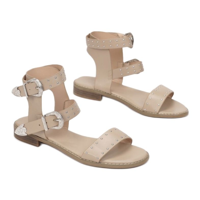 A szandálok dizájnja a lábujjaknál és a bokánál széles pántokkal gyönyörködtet, amelyeket szegecsekkel és szemet gyönyörködtető csatokkal díszítenek, így stílusos megjelenést kölcsönöznek nekik. Kiváló minőségű ökobőrből készült, mind a felsőrész, mind a talpbetét tartósságot és könnyű kezelhetőséget biztosít, így praktikus megoldás a mindennapi használatra.