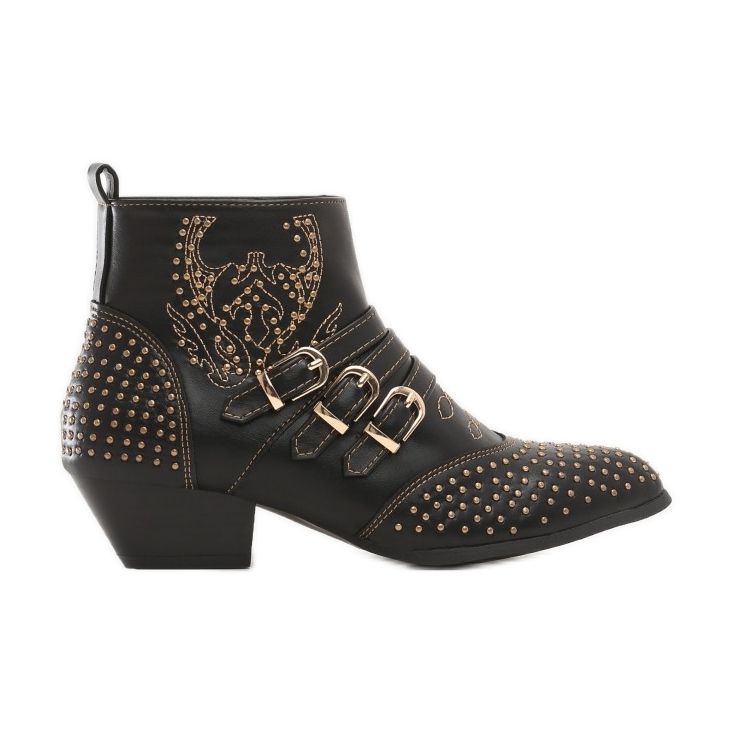 A csizmák oldalán cipzárral vannak rögzítve, ami megkönnyíti a fel- és levételüket. Ezenkívül a dizájn finom részletekkel gazdagodik, kis strasszok és három stílusos csat formájában, amelyek eredetiséget kölcsönöznek nekik. A mandula alakú orr és a magas boka felsőrész eleganciát és elegánsságot ad, a szintetikus talp pedig tartósságot és támogatást biztosít minden lépésnél.