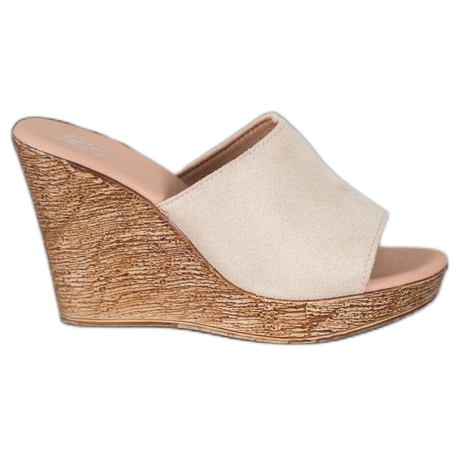 A lábbeli felsőrésze egy széles pántból áll, amely stabil lábtartást biztosít, a finom bézs árnyalatú, ökológiai velúr bőr pedig elegáns. A 10,5 cm magas, barna szintetikus anyagból készült ék nem csak optikailag karcsúsítja a lábakat, de a 2,5 cm magas platformnak köszönhetően hosszú séták során is kényelmet biztosít.