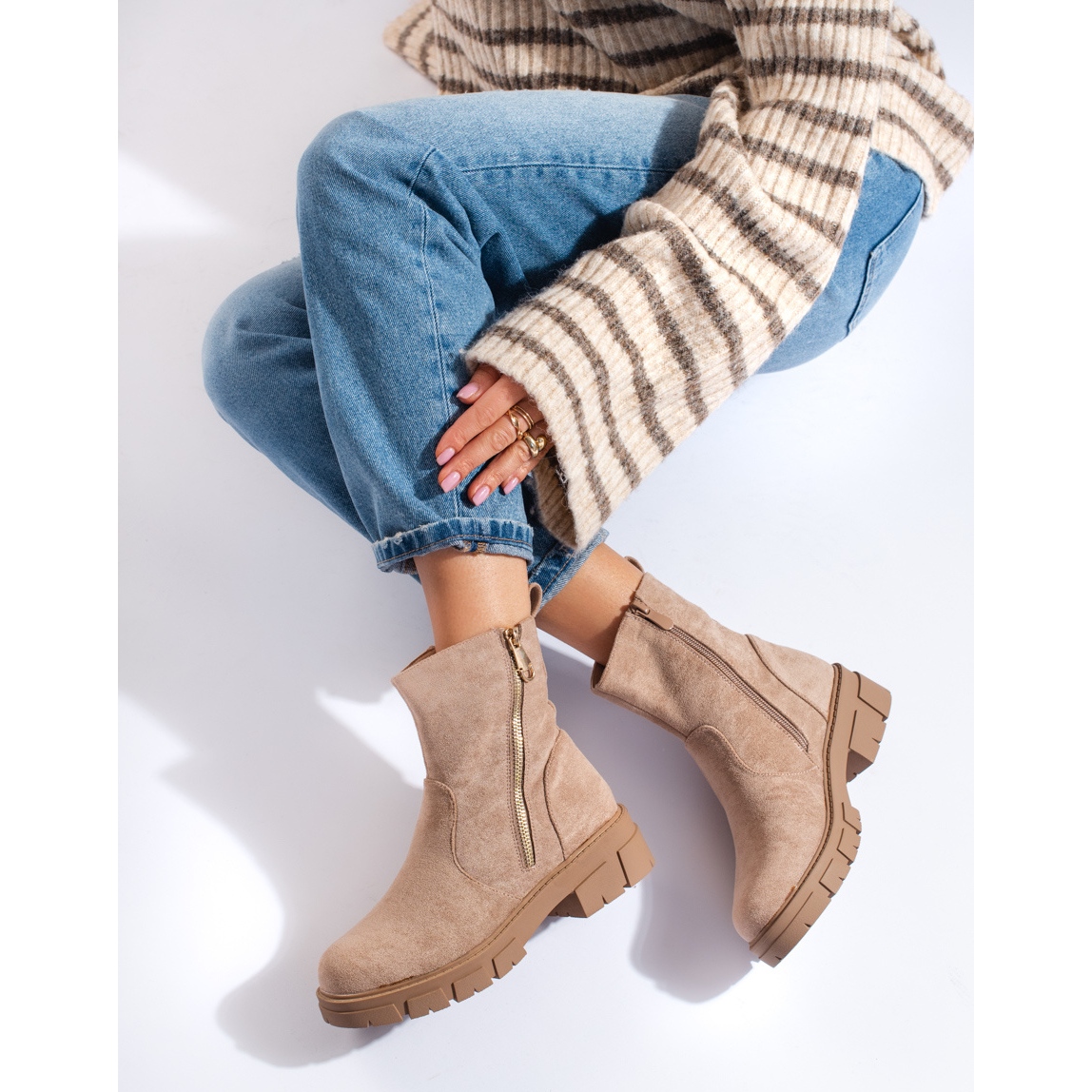 Részletek: Vinceza bézs színű velúr bokacsizma dekoratív cipzárral