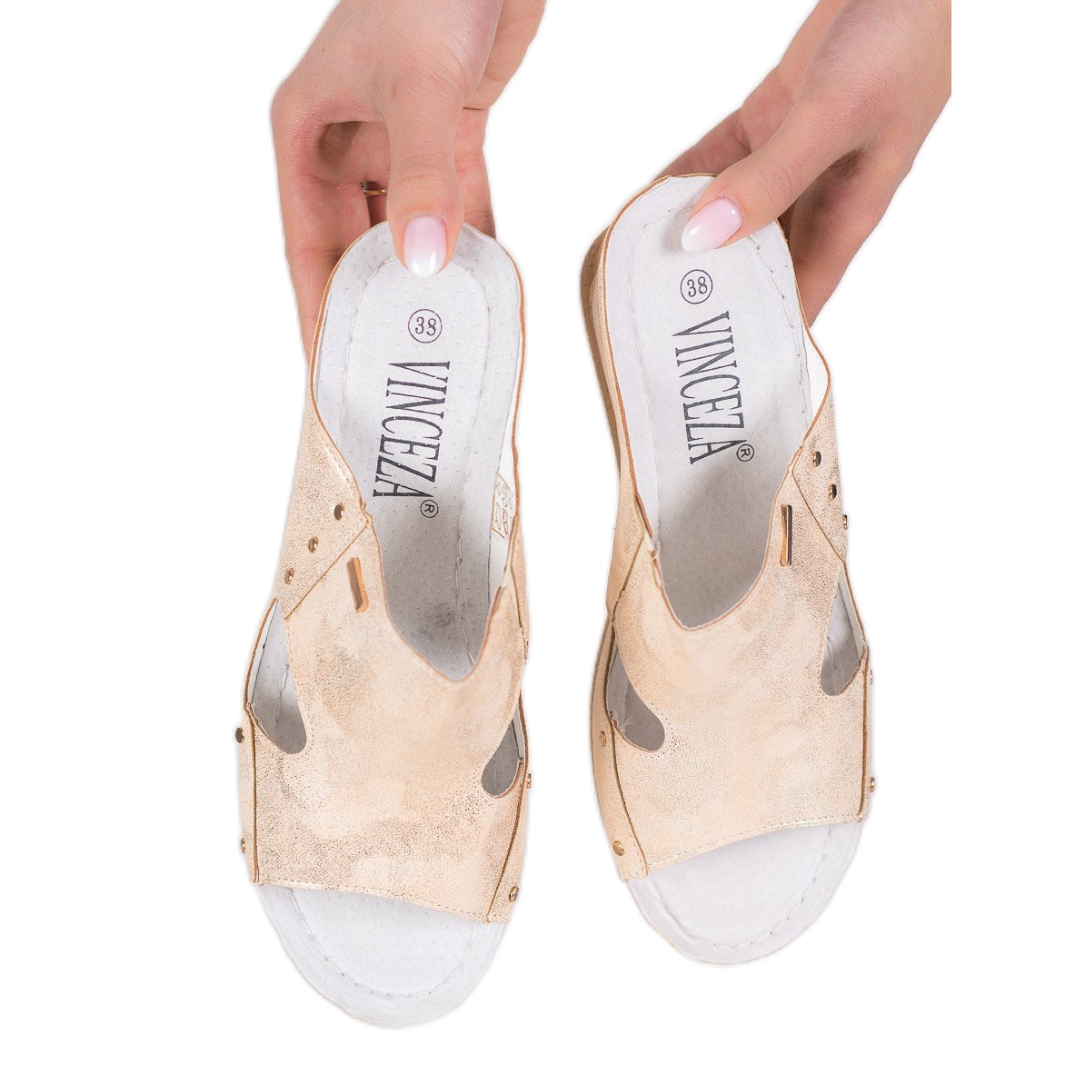Fedezze fel a páratlan stílust és kényelmet a lenyűgöző arany színű VINCEZA éköszvérekkel! Ezek az egyedi cipők ideális ajánlat azoknak a nőknek, akik értékelik az eredetiséget és a mindennapi eleganciát. A kiváló minőségű ökológiai bőrből készült papucsok nemcsak divatosnak tűnnek, de környezetbarátak is.
