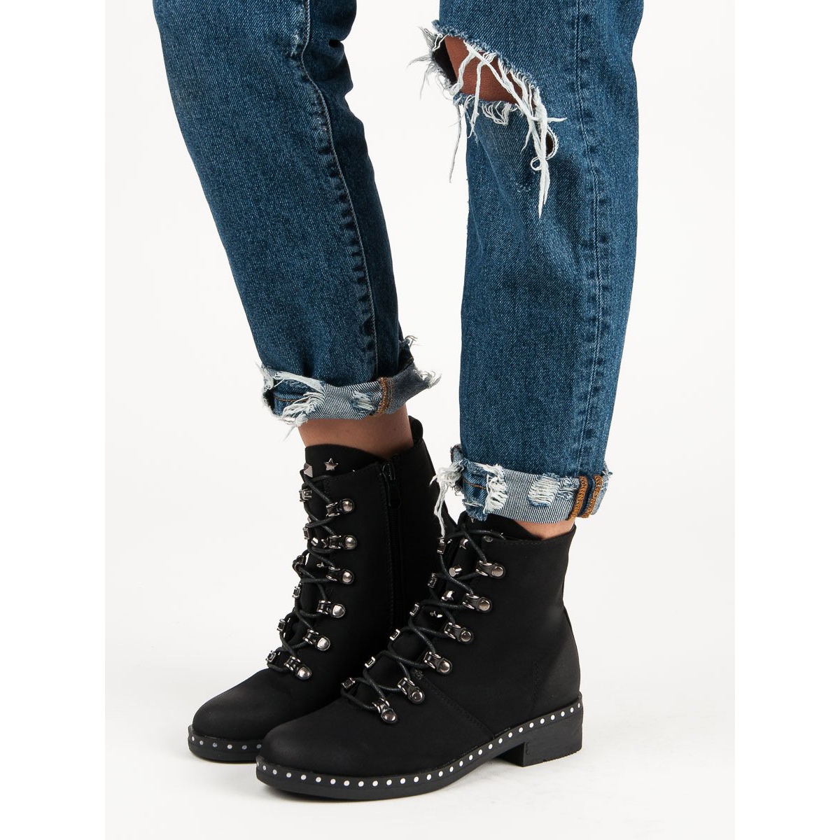 A VINCEZA baggerek a klasszikus és a modern kombinációja - a cipzár és a fűzés megkönnyíti a felhelyezésüket, a dekoratív ezüst szegecsek és strasszok formájában megjelenő részletek pedig karakteressé teszik őket. A 4 cm-es lapos sarok nem csak stílusossá teszi ezeket a cipőket, de egész nap kényelmes is.