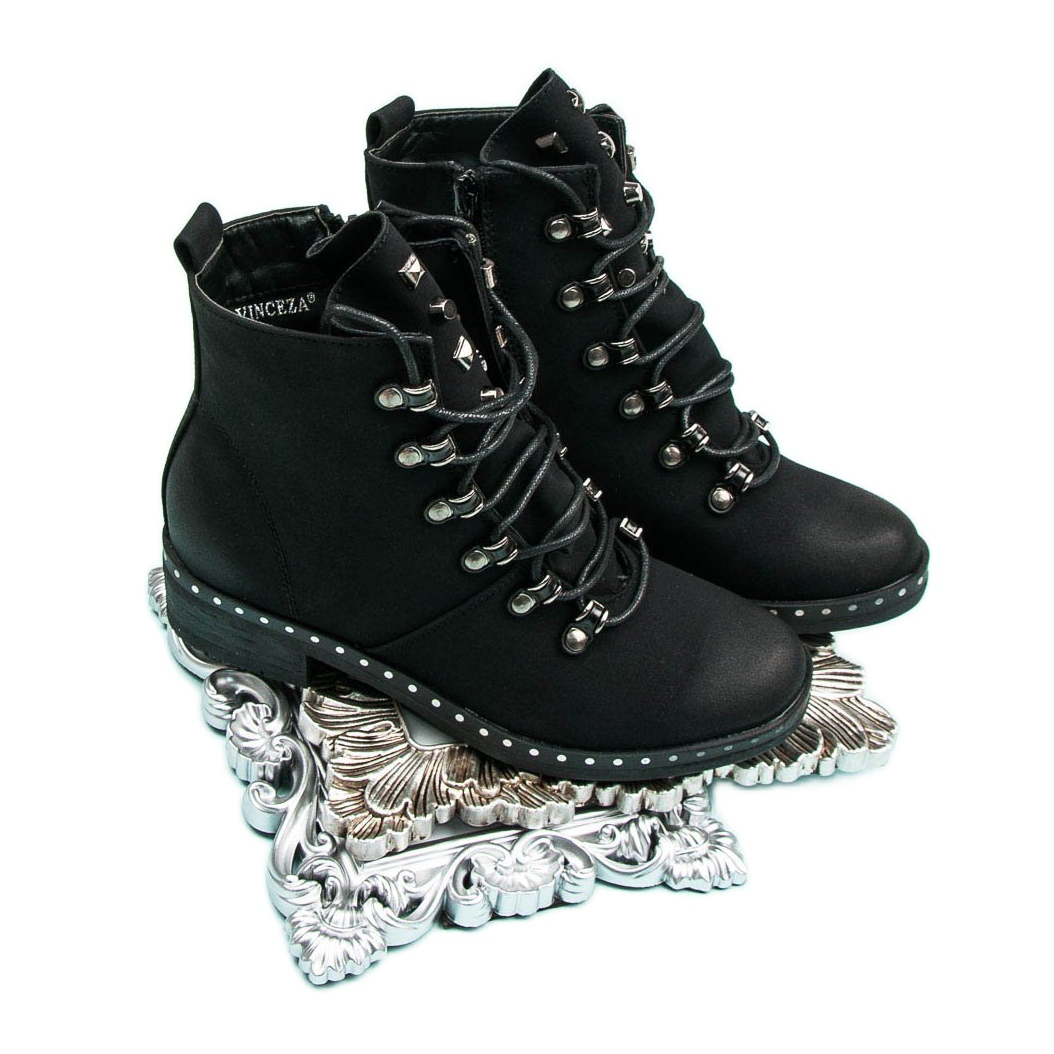 Kétségtelen, hogy a fekete VINCEZA fűzős munkások tökéletesen megfelelnek egy modern nő igényeinek, ideális választás a mindennapi kirándulásokhoz. Fektessen be kényelmébe és stílusába, ha ezt az egyedi bokacsizmát választja.
