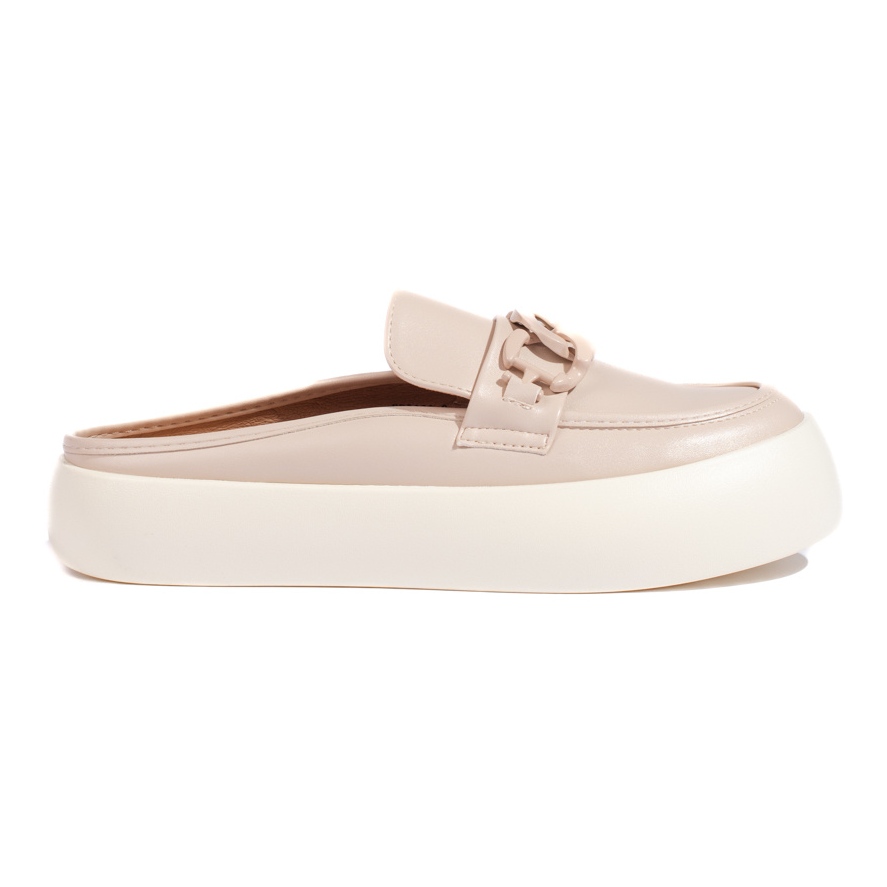 A papucsot a kényelemhez tervezték - sík sarokuk 3 cm magasságú és a behelyezett kapocs miatt rendkívül egyszerűen felhelyezhető. A nyitott sarok és a kerek orr könnyedséget ad nekik, és ugyanakkor kellemesen kiegészíti az egyes stilizációkat, mind a napi kimenetek, mind az elegánsabb alkalmak esetén.
