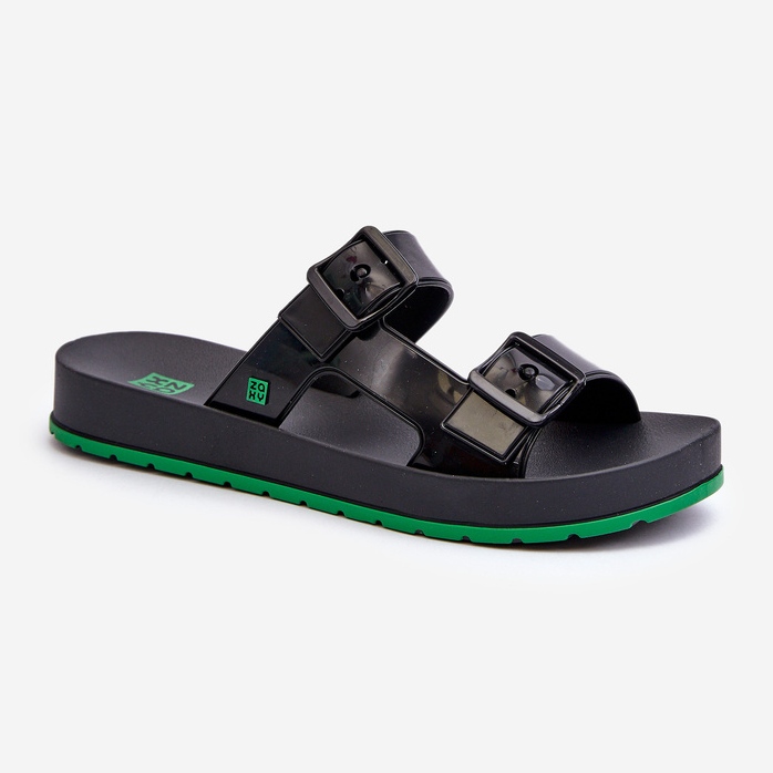 Ezeket a papucsokat csúszó kapocs, orrhiány és 3 cm magasságú lapos talp jellemzi, amely gyalogláskor maximális kényelmet biztosít. További részletek, mint például a talp zöld színe, modern megjelenést adnak nekik.