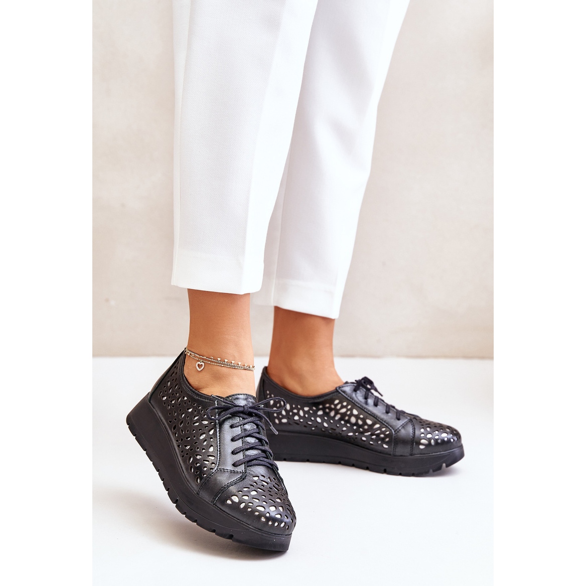 Zazoo Zazoo 2973 bőr platformcipő áttört mintával, fekete