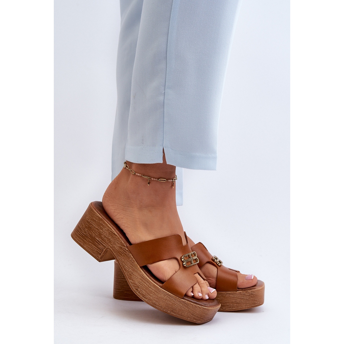 Részletek: Zazoo 40412 bőr elegáns női papucs arany díszítéssel, barna