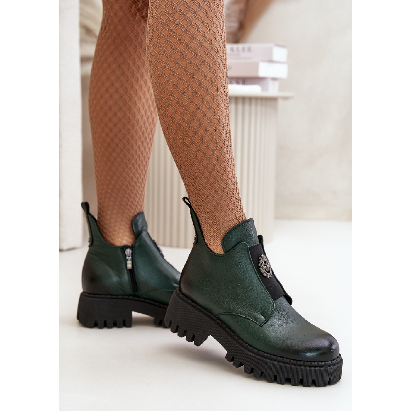 Bemutatjuk a női Zazoo csizmát egy gyönyörű, sötétzöld árnyalatban, amely tökéletesen kiegészíti a szekrényét. Kiváló minőségű természetes bőrből készülnek, és ötvözik a kényelmet és az eleganciát. Egyedülálló kialakításuk, amely egy hatalmas sarokon alapul, 6 cm magasságban és egy 3,5 cm -es hornyokkal rendelkező platformon, biztosítja a stabilitást és a kényelmet.
