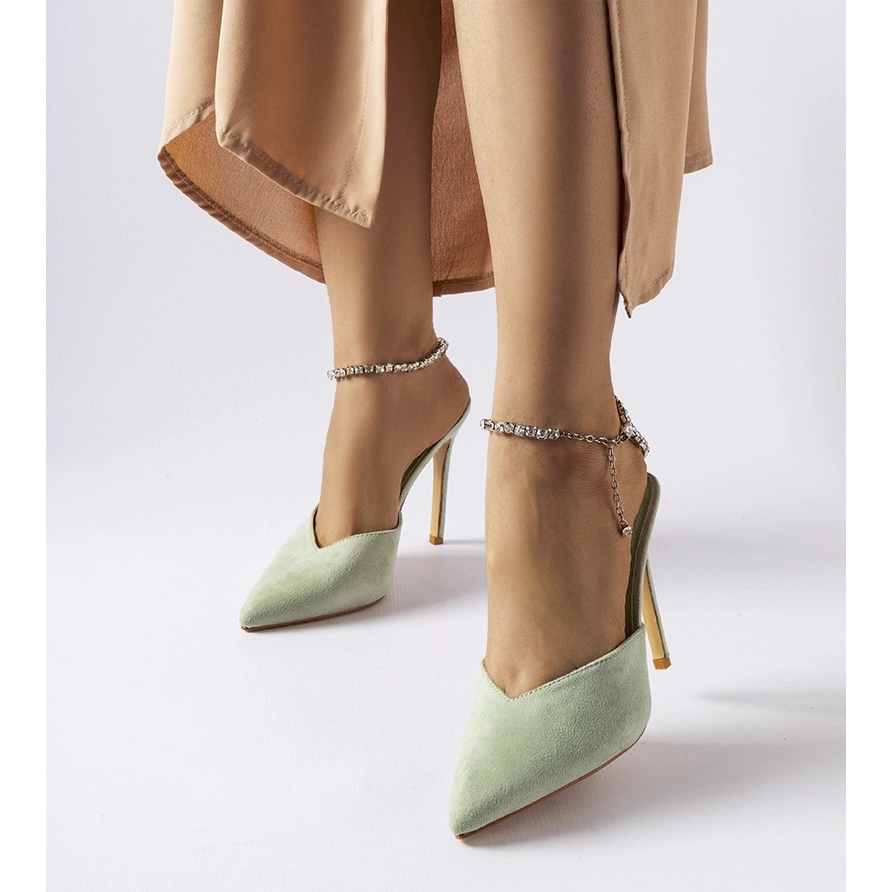 A fenomenális Claude zöld papucsok a női finomság és az kifejező karakter kombinációja. Szőrök ökológiai bőrből készül, fényes cirkonokkal díszítve, vékony 11 cm -es tűvel. Tökéletes nyári partikhoz, esti kirándulásokhoz és egyedi alkalmakhoz.