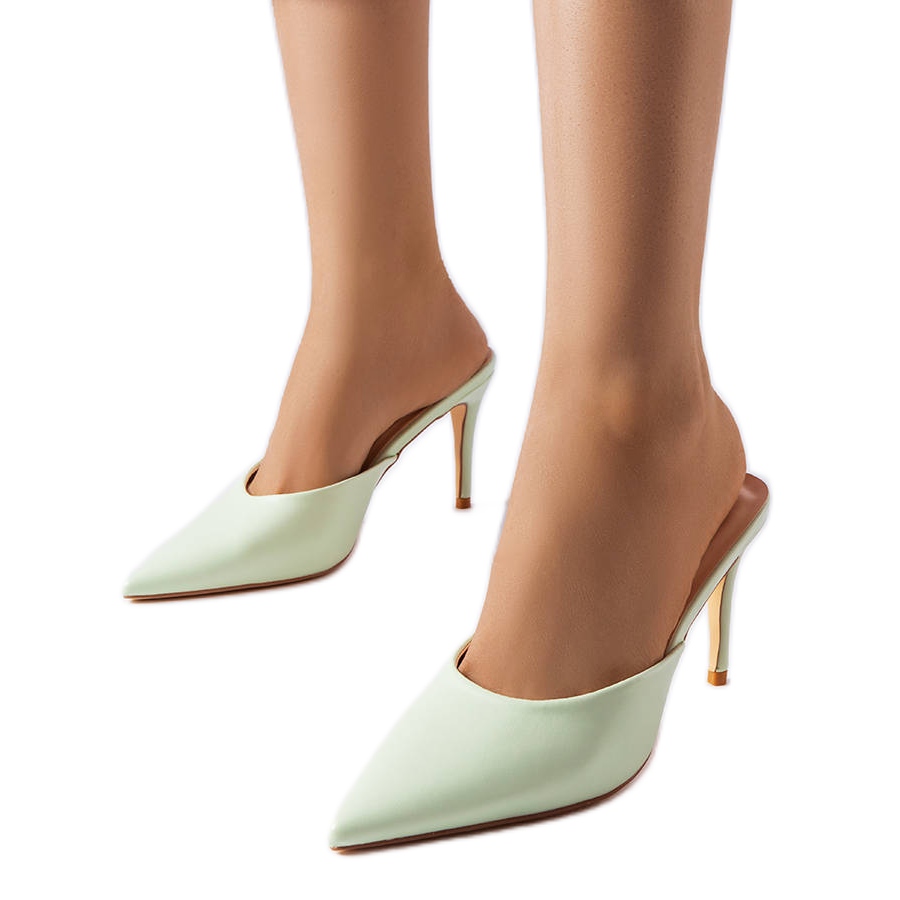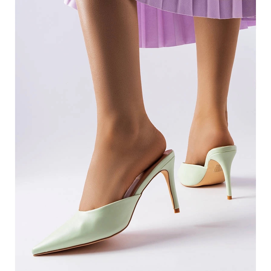 Zöld papucs a lefolyócsapon - hatékony akcentus a nyári stilizációkhoz. A karcsú, 10 cm -es tű és a Spitz hosszúkás orra finoman hangsúlyozza a női figurát, és a felfedezett sarok könnyedséget és nyári karaktert ad. Teljesen ökológiai bőrből készül, mély, visszafogott zöld árnyalatban (gyártó színe: zöld) - elegáns és univerzális.