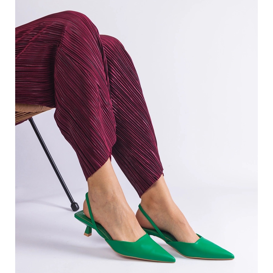 A szivattyúk zöld színe tökéletesen illeszkedik a nyári trendekhez, és a bézs műanyag talp finom kontrasztot ad. A hegyes fuvarozó hangsúlyozza a cipők eleganciáját, így tökéletesen kiegészítik őket a mindennapi és az esti stilizációkhoz.