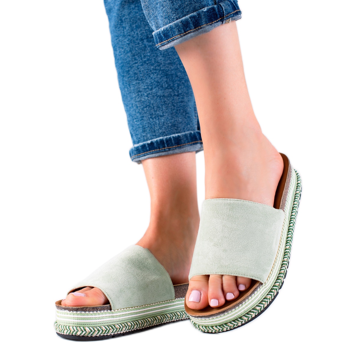 A papucsok kiváló minőségű anyagokból készülnek - a külső réteg 100% textil, a belső pedig műbőr, ami tartóssá és esztétikussá teszi őket. A zöld szín, további minták nélkül a legújabb trendekhez igazodik, a klasszikus és lezser stílus pedig a nyári ruháktól a rövidnadrágokig és felsőkig sokféle outfithez passzol.