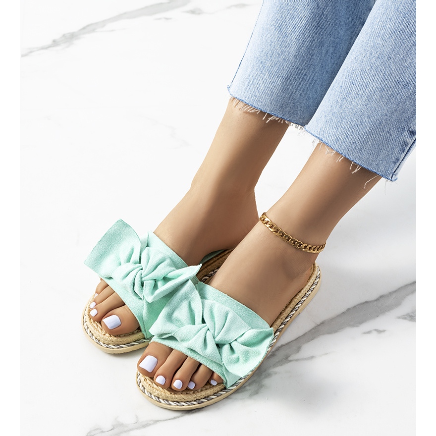 Az Avi zöld, masnival ellátott papucsai az idei nyár egyedi slágerei, és minden nő ruhatárába kell, hogy kerüljenek! Nőies dizájnjukat egy gyönyörű velúr masni emeli ki, ami tökéletes kiegészítője a mindennapi stílusoknak, különösen a ruhásoknak.