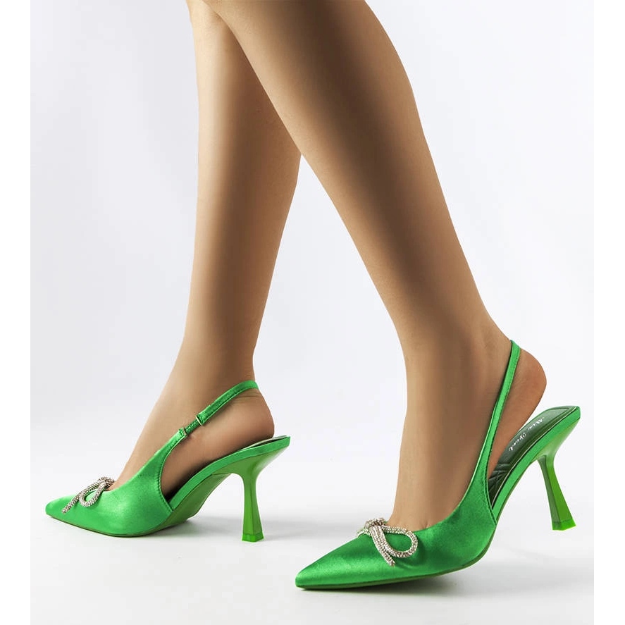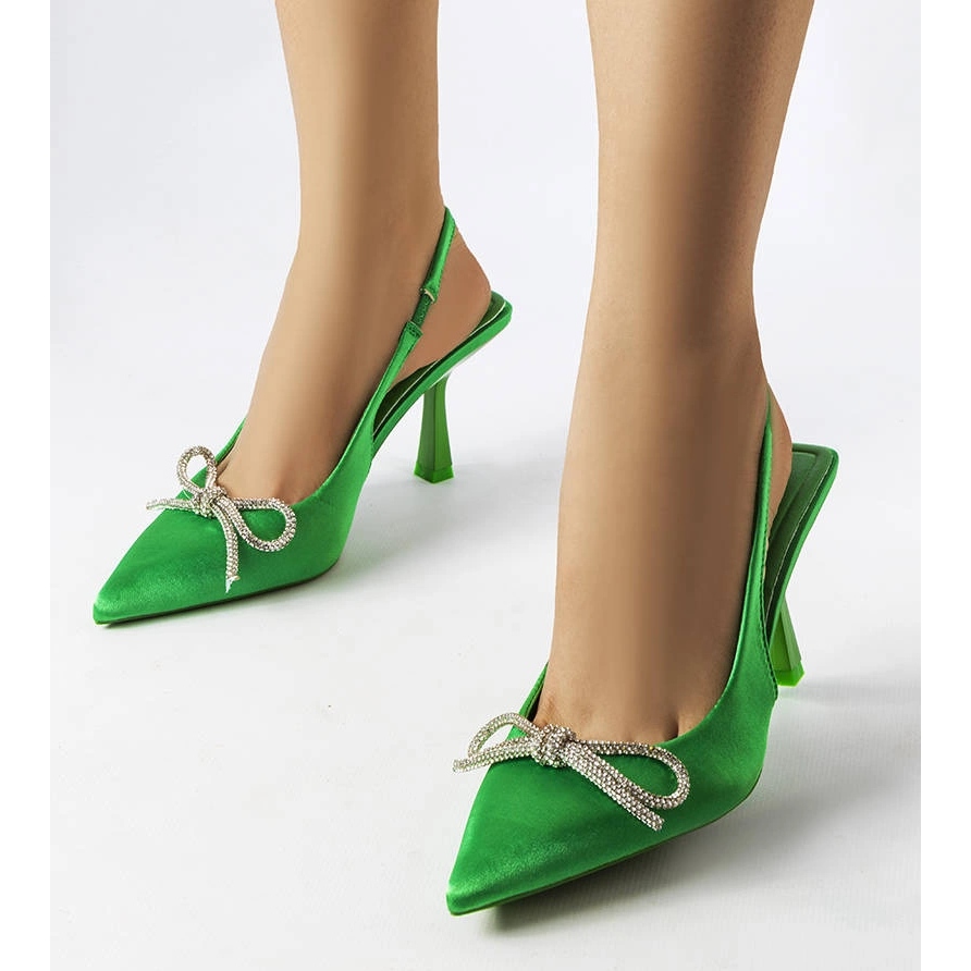 Zöld magas sarkú cipő egy vadrésű íjjal - nőies elegancia nyári karommal