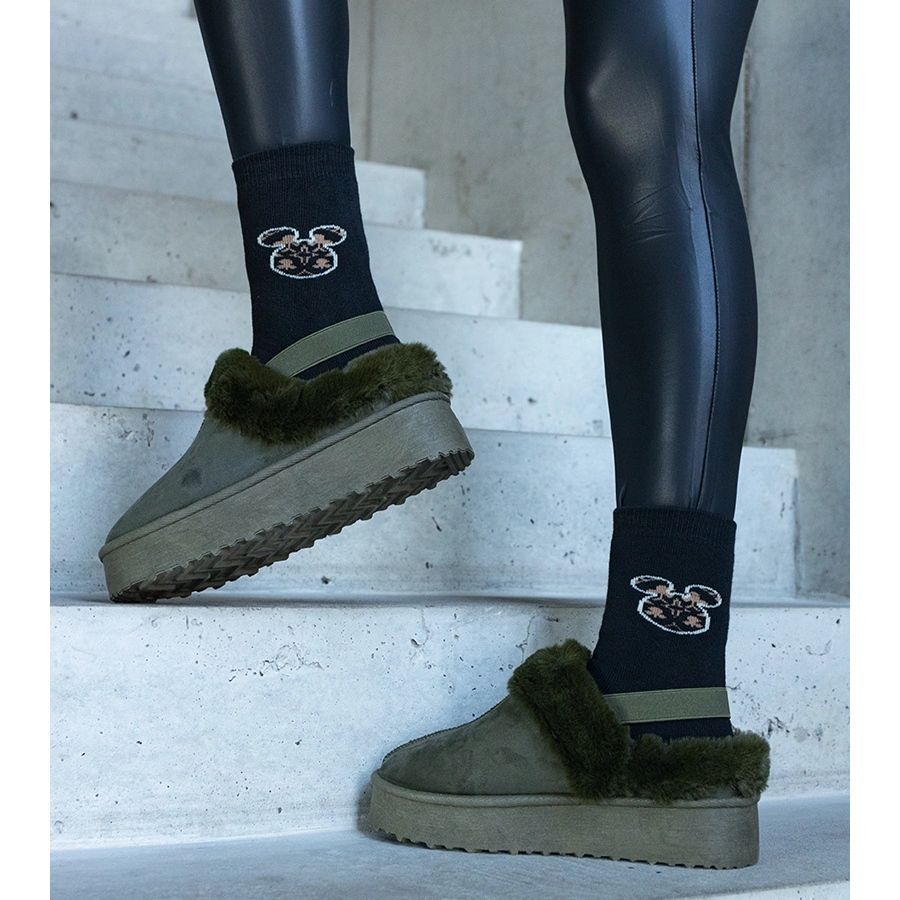 A frank platformon lévő zöld papucs kiváló választás minden olyan nő számára, aki a téli napokon el akarja kombinálni a kényelmet az elegáns stílussal. Meleg, szőrme bélésük hatékonyan megvédi a lábakat a hidegtől, és a sarok elasztikus megkönnyíti a felhelyezést és biztosítja a stabilitást a viselés során.